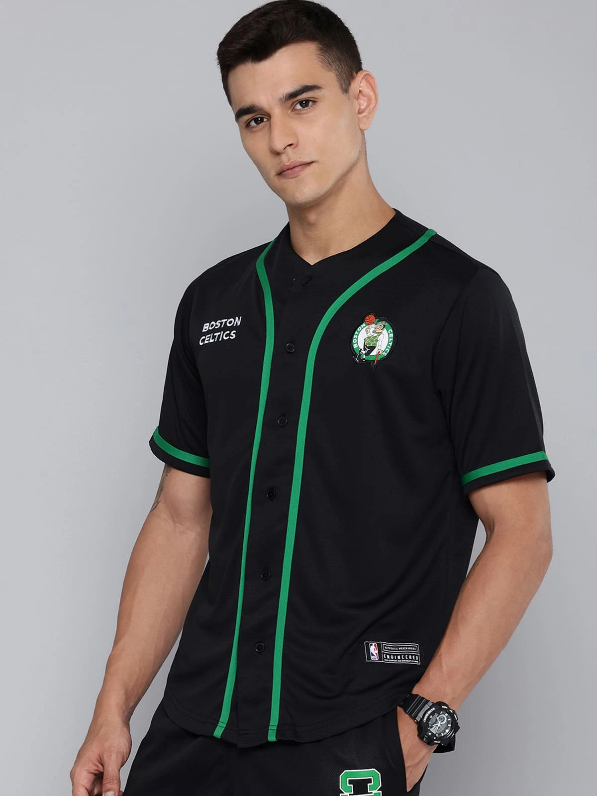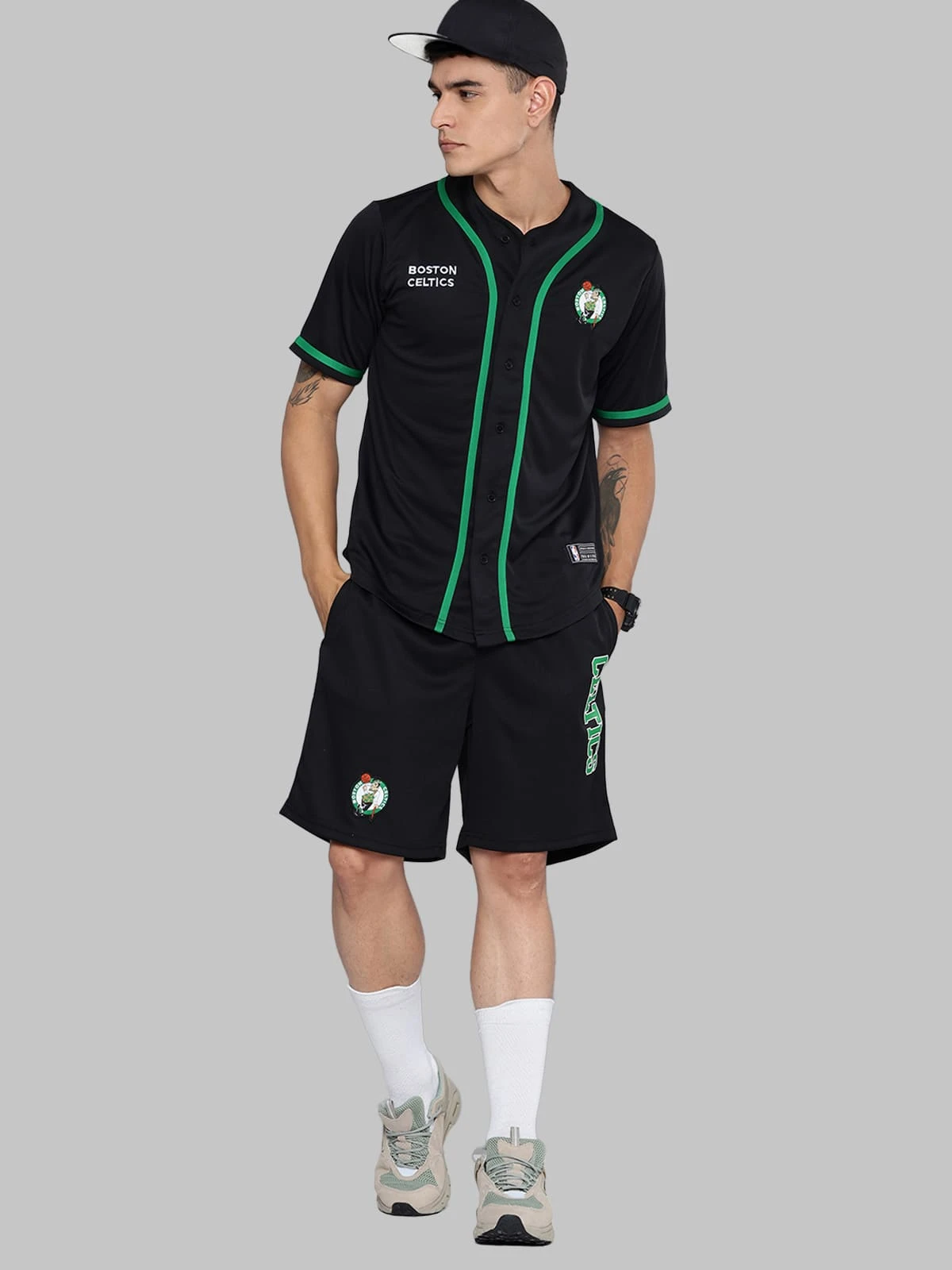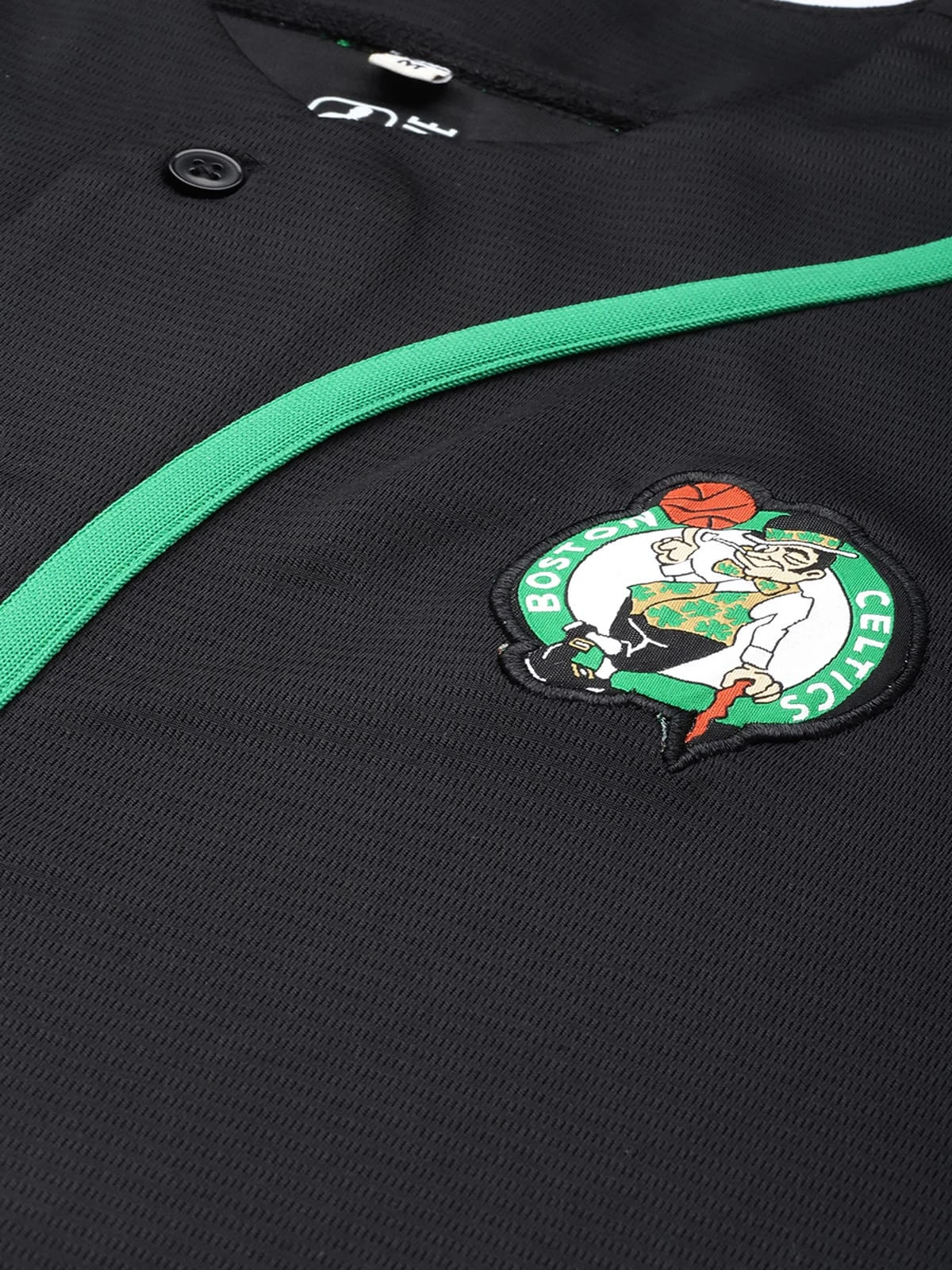 Baseball shirt with Boston Celtics wordmark on right chest, and logo applique on left chest. Contrast colour piping along sleeve and buttons. Gender: Unisex Fabric: 100% Poly Rice Knit Fit: Regular fit Brand: National Basketball Association
