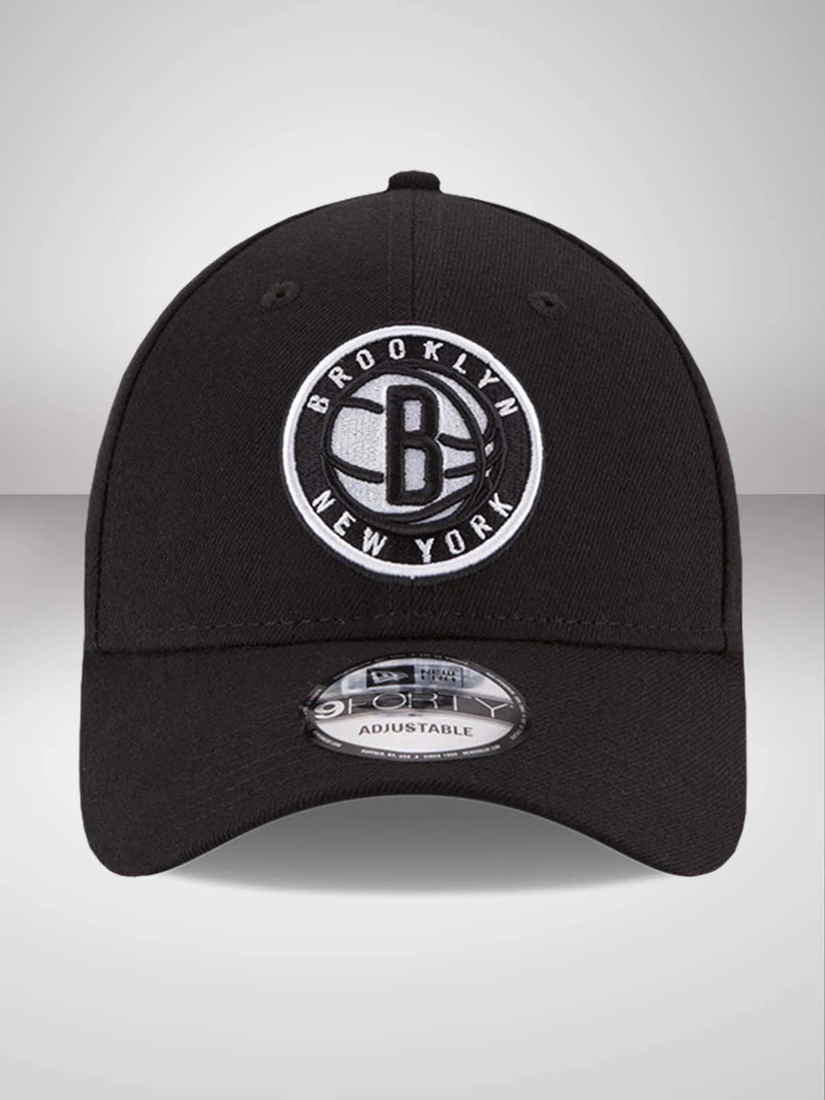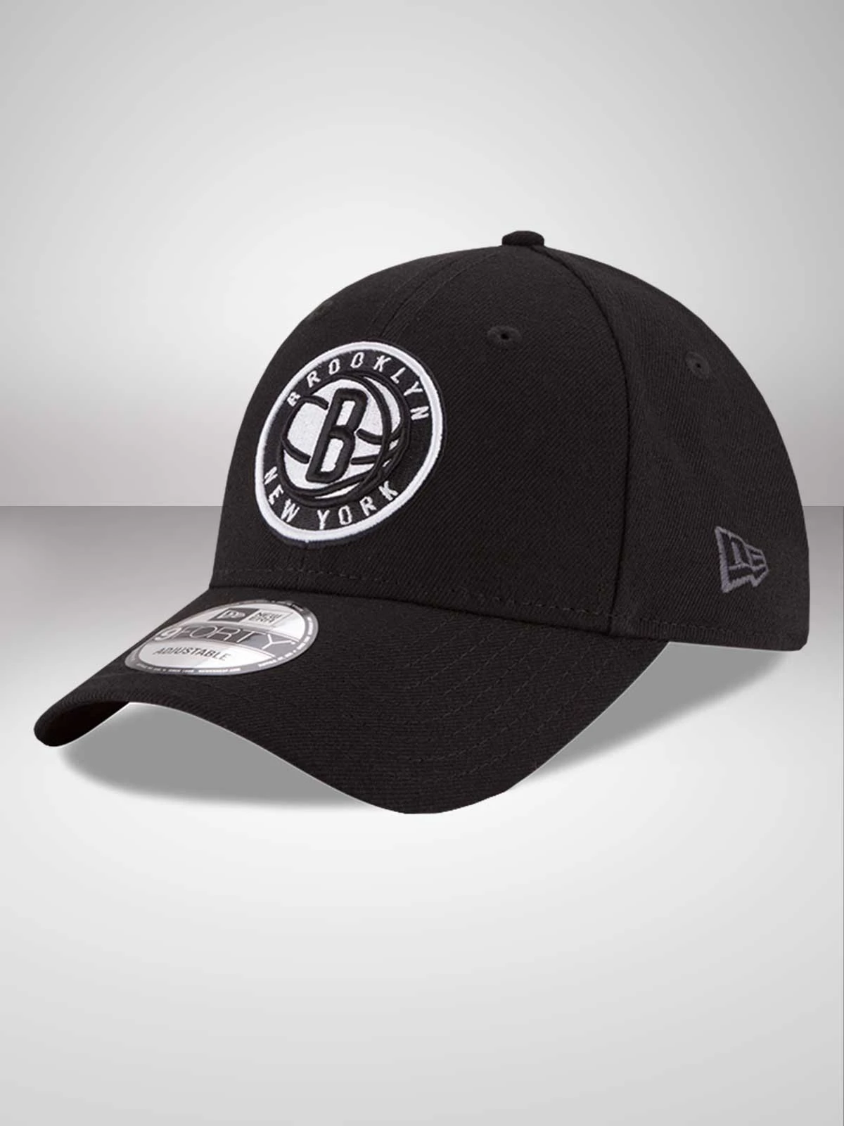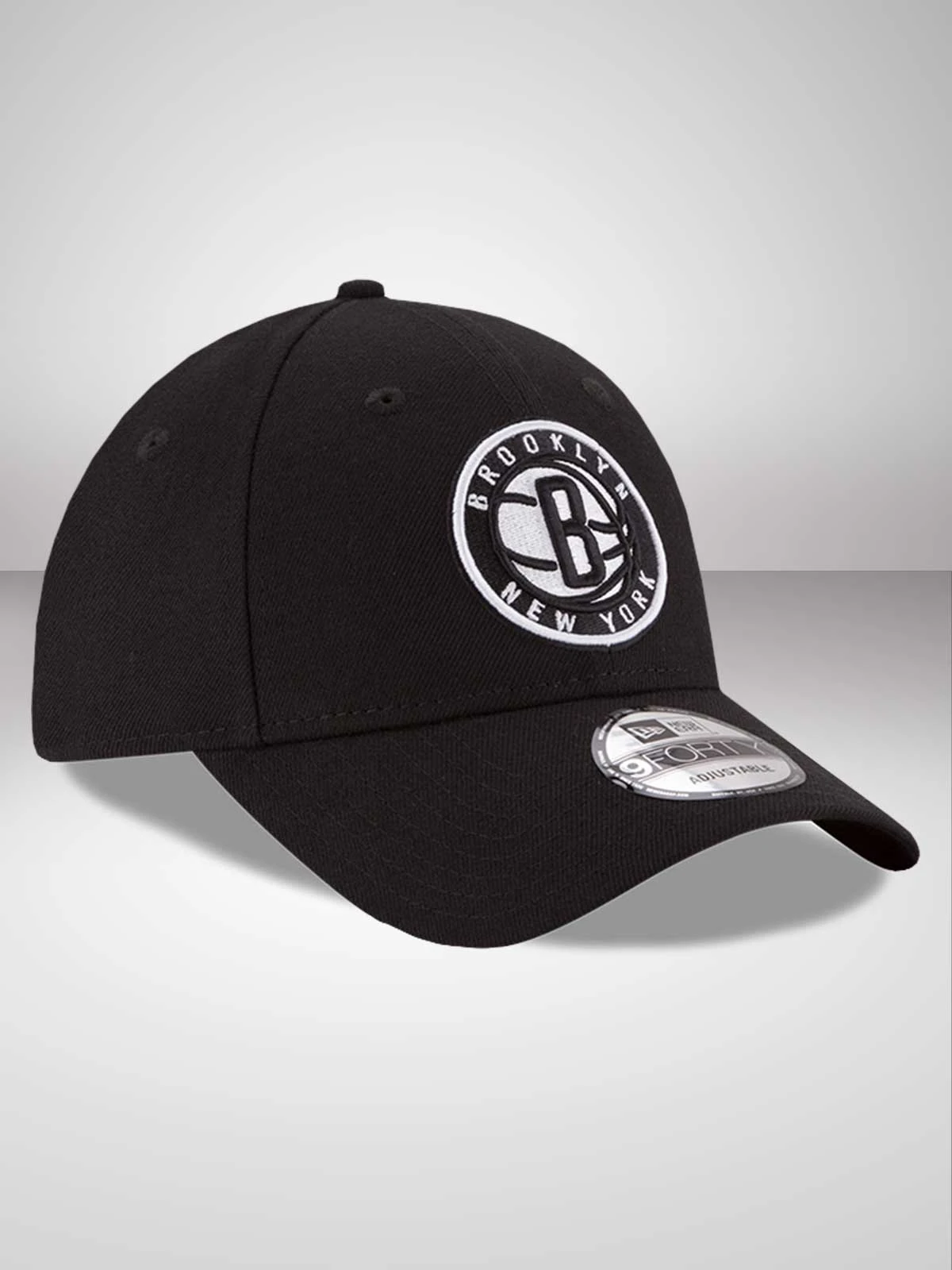 Fully adjustable 9FORTY profile. 6-panel, close fitting contoured crown. Matching curved visor. All-over team black fabric Nets’ team emblem roundel embroidered to the front of the crown in raised stitching. Woven tab to the rear strap. Matching black top button and stitched eyelets for breathability. New Era flag embroidered in contrast white stitching to the left hand side.
