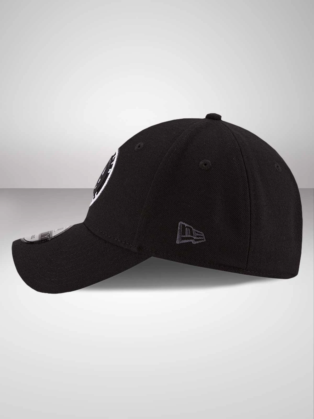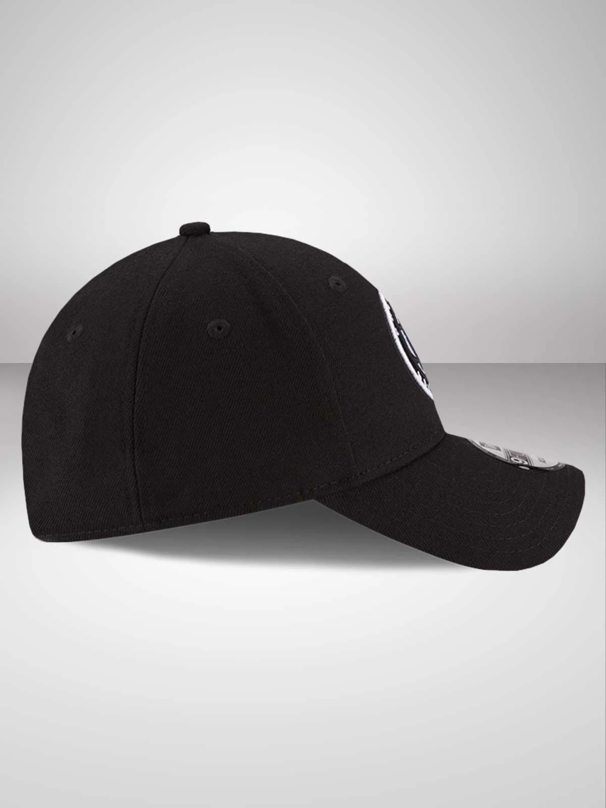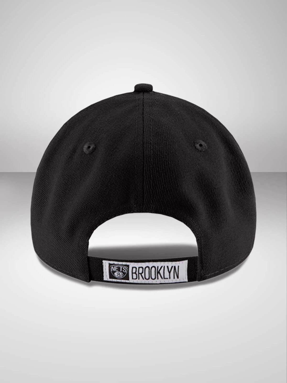 Fully adjustable 9FORTY profile. 6-panel, close fitting contoured crown. Matching curved visor. All-over team black fabric Nets’ team emblem roundel embroidered to the front of the crown in raised stitching. Woven tab to the rear strap. Matching black top button and stitched eyelets for breathability. New Era flag embroidered in contrast white stitching to the left hand side.