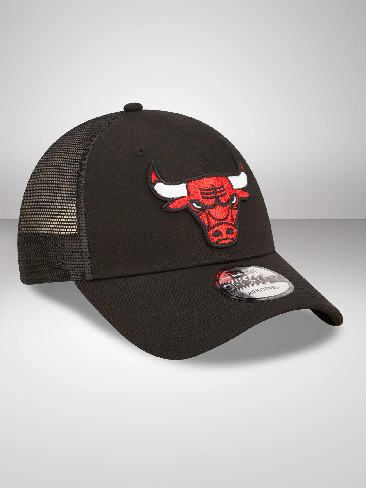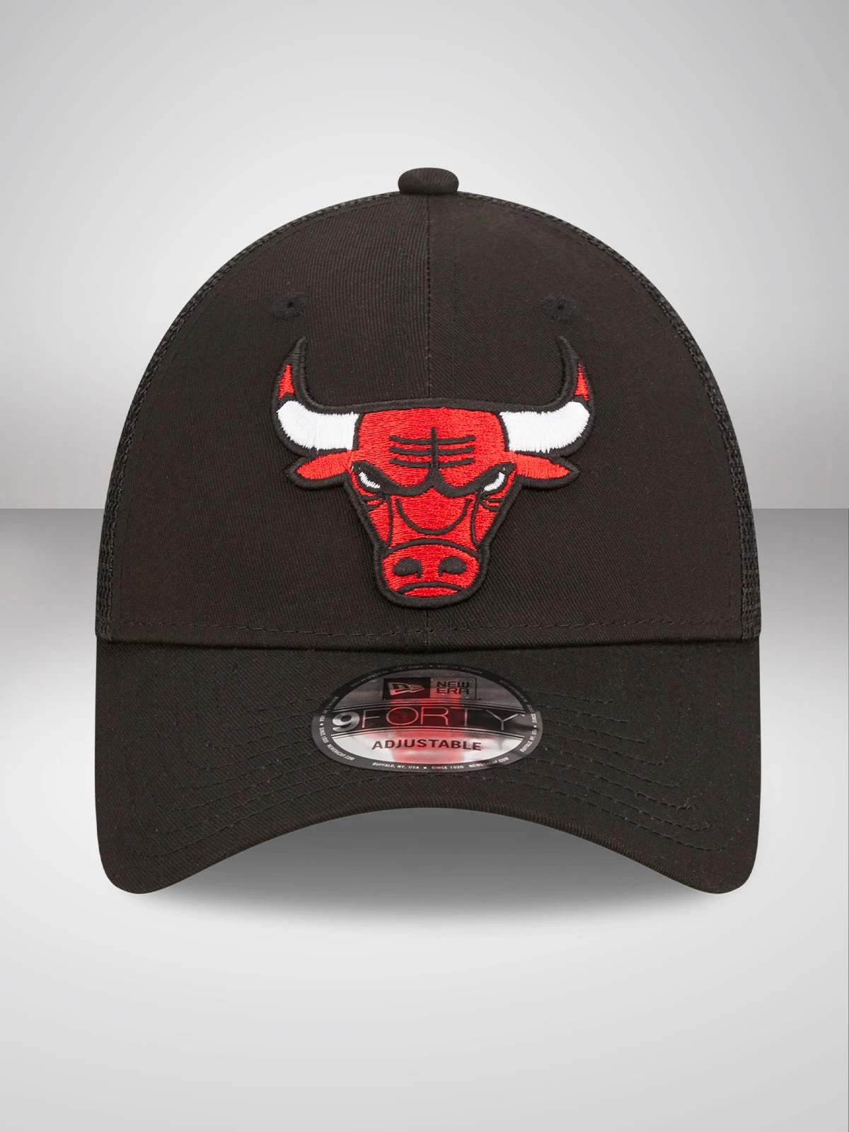Official New Era Home Field 9FORTY Chicago Bulls A-Frame Trucker Cap. Bulls logo on front. New Era Flag on left. Bulls woven label on rear. Structured crown. Velcroback. Curved visor. Mesh back and sides. For: Unisex Fabric: 100% Cotton Fit Type: One Size Fits Most Team: Chicago Bulls