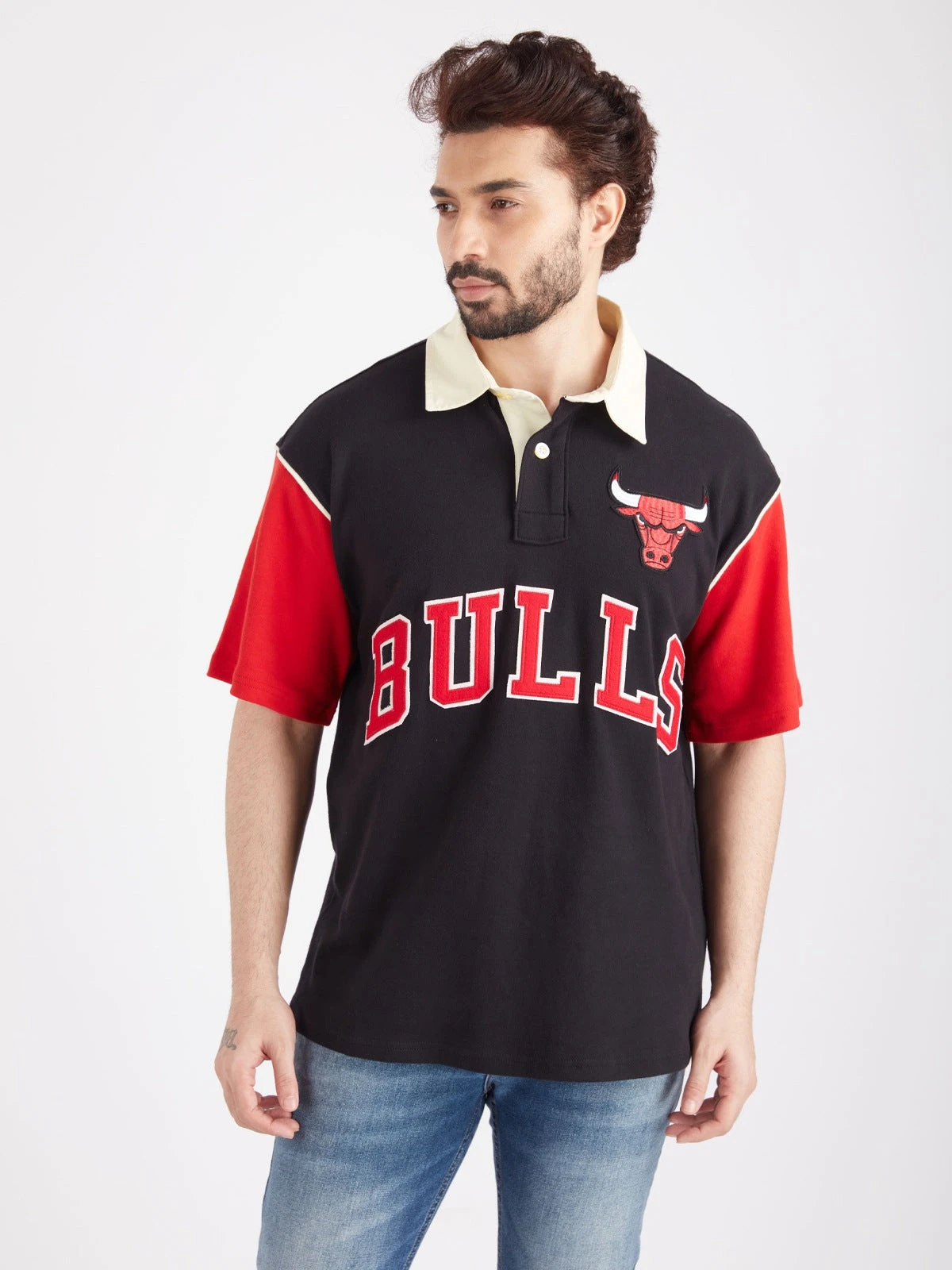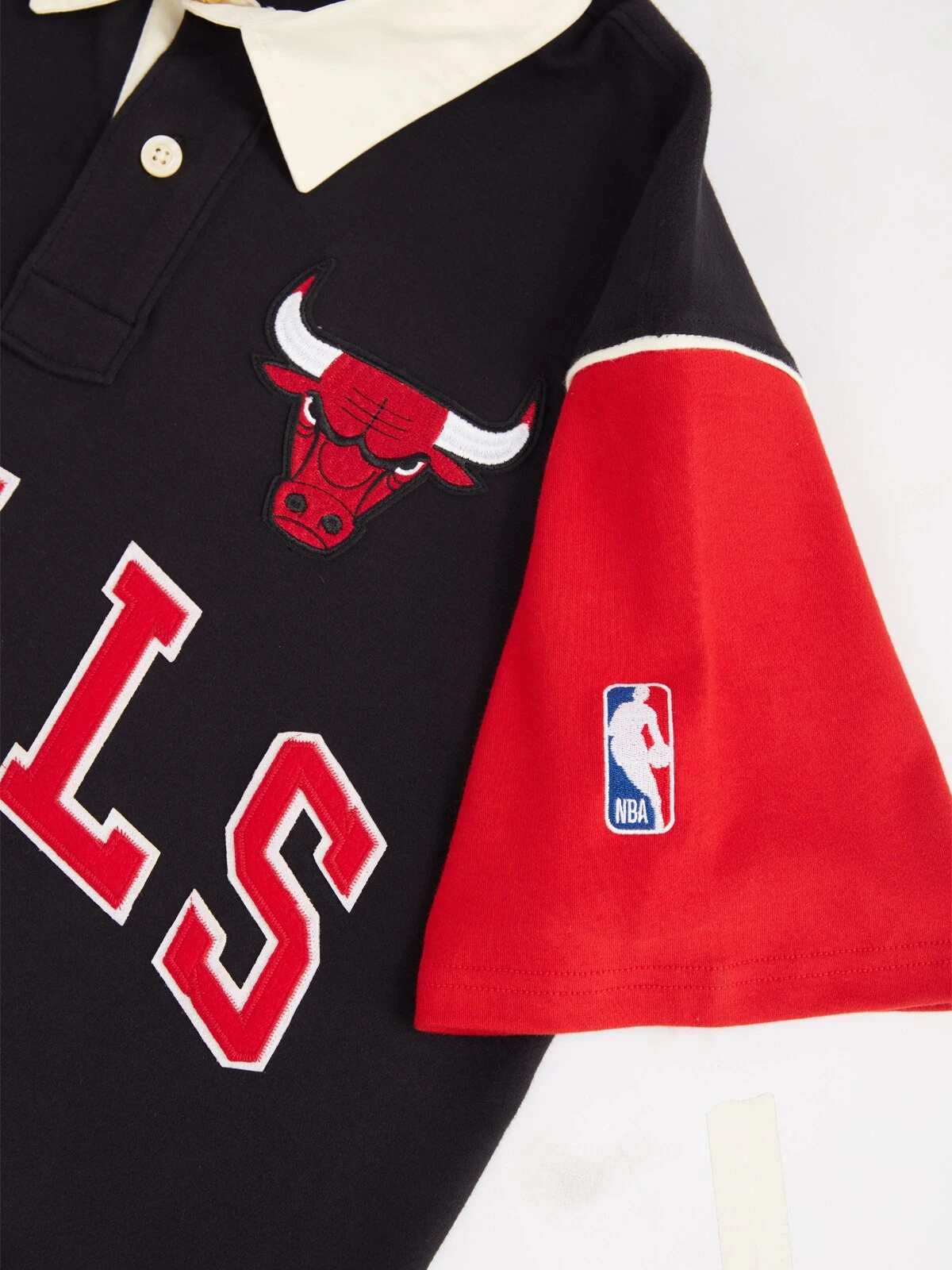 Oversized polo with Bulls wordkmark applique to the centre front Contrast colour sleeve with NBA logo embroidered Gender: Unisex Fabric: 100% Cotton Fit: Oversized Fit Brand: National Basketball Association