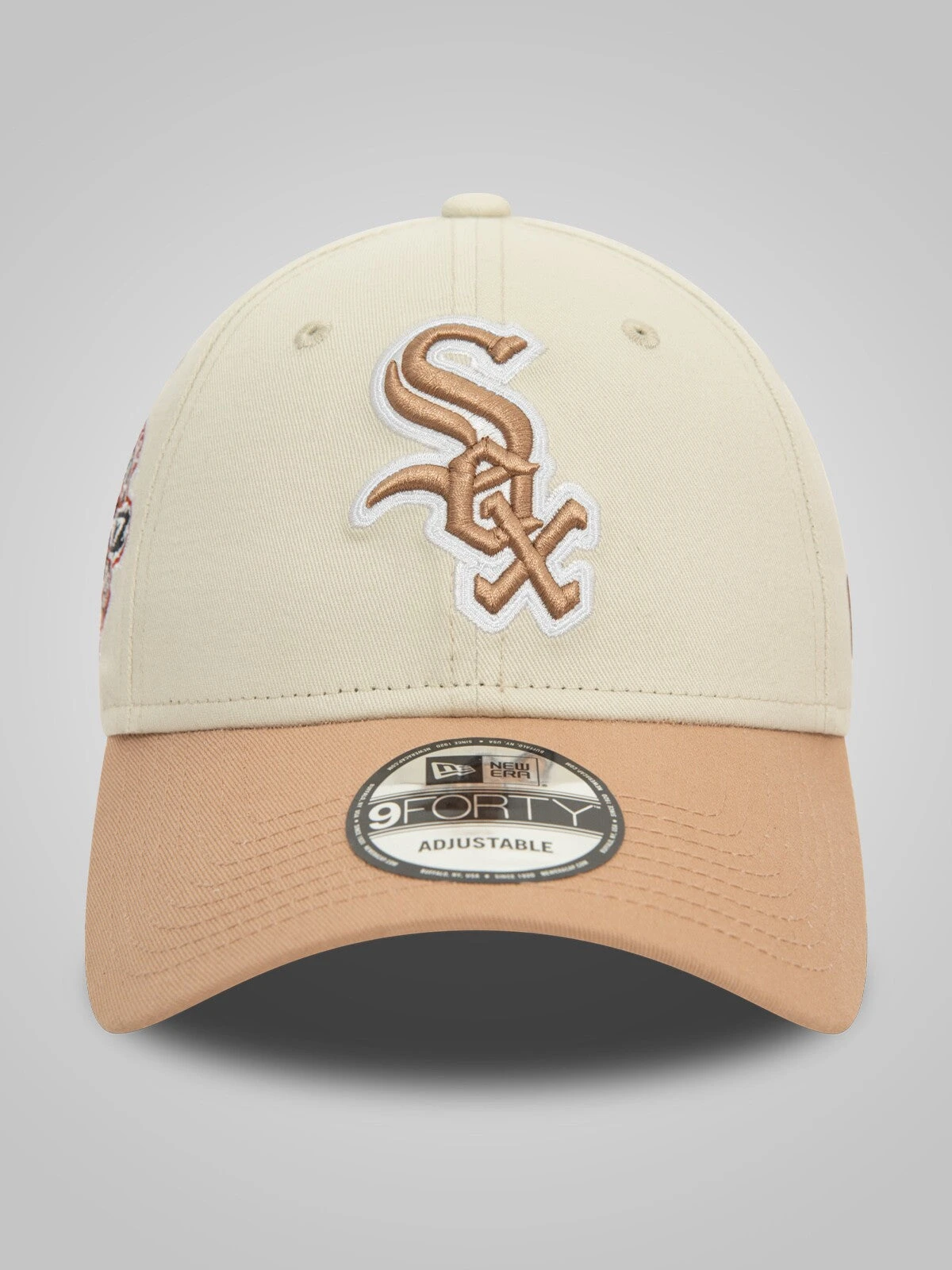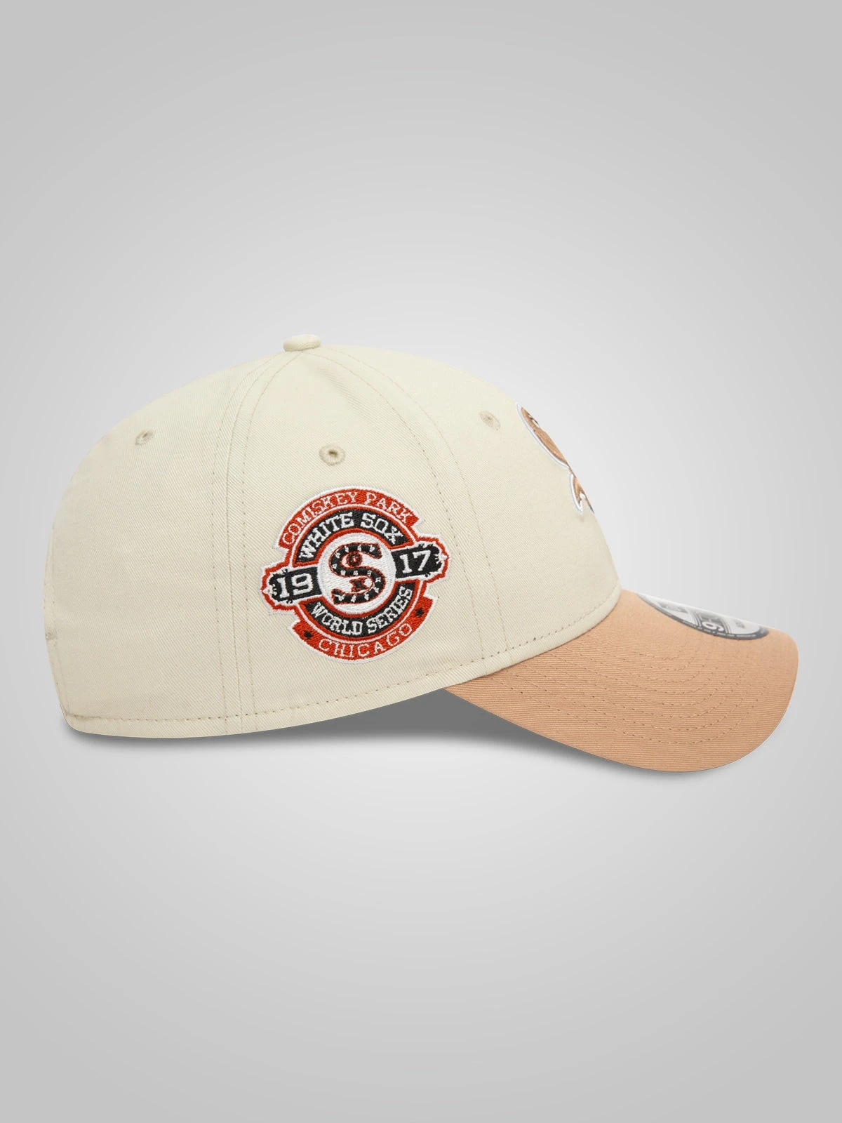Chicago White Sox logo on front Cooperstown World Series sidepatch on right New Era Flag embroidered on left Structured crown Strapback Curved dark beige visor Dark beige undervisor Gender: Unisex Fabric: 100% Cotton Fit: Baseball Cap Brand: Major League Baseball