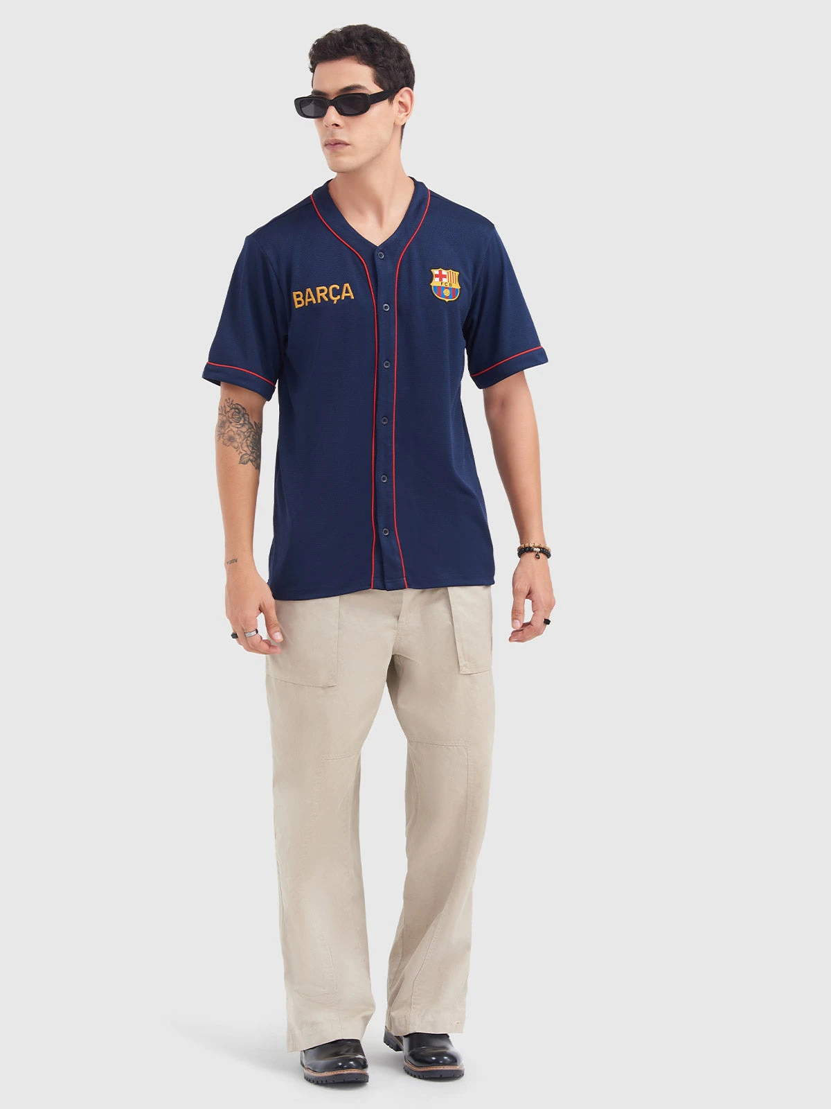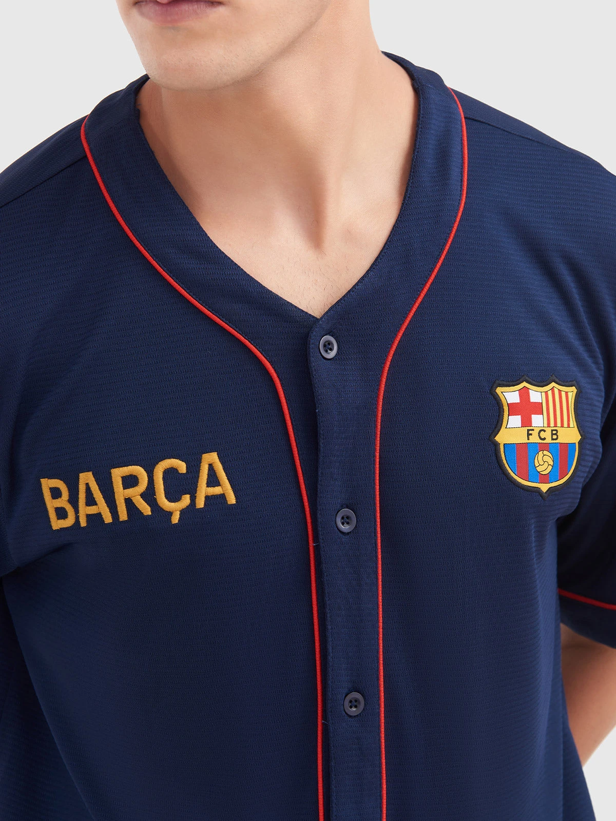 Baseball shirt with FC Barcelona wordmark on right chest, and logo applique on left chest. Contrast colour piping along sleeve and buttons. Gender: Unisex Fabric: 100% Poly Rice Knit Fit: Regular fit Brand: FC Barcelona
