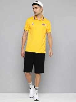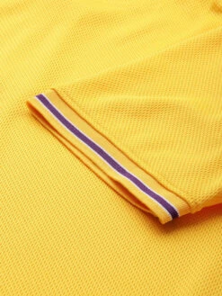 Elevate your style game with our Los Angeles Lakers Performance Polo! This vibrant yellow polo, accented with sleek purple & white tape on collar and sleeves; not only exudes sporty elegance but also brings the Lakers spirit to life. With the iconic Lakers logo proudly emblazoned on the left chest and the NBA logo on the right, this polo is a must-have for every die-hard fan. Perfect for game nights or a casual day out, it adds a dash of athletic flair to your wardrobe. Get ready to score compliments and show off your team pride. For: Men Fabric: Poly Rice Knit Fit Type: Regular Fit Washcare: For all Dark colours, please wash with similar colours for the first few cycles. DO NOT IRON ON THE PRINT. Please make the garment inside out and then Iron.