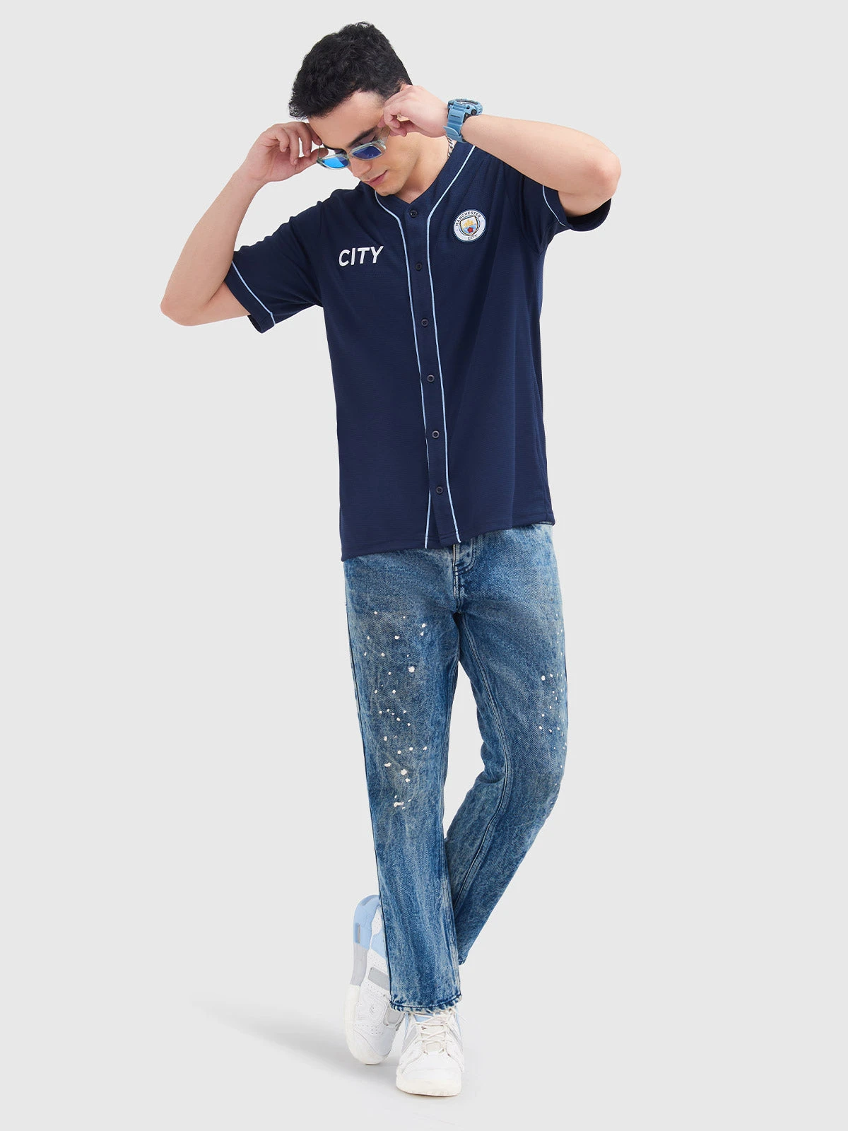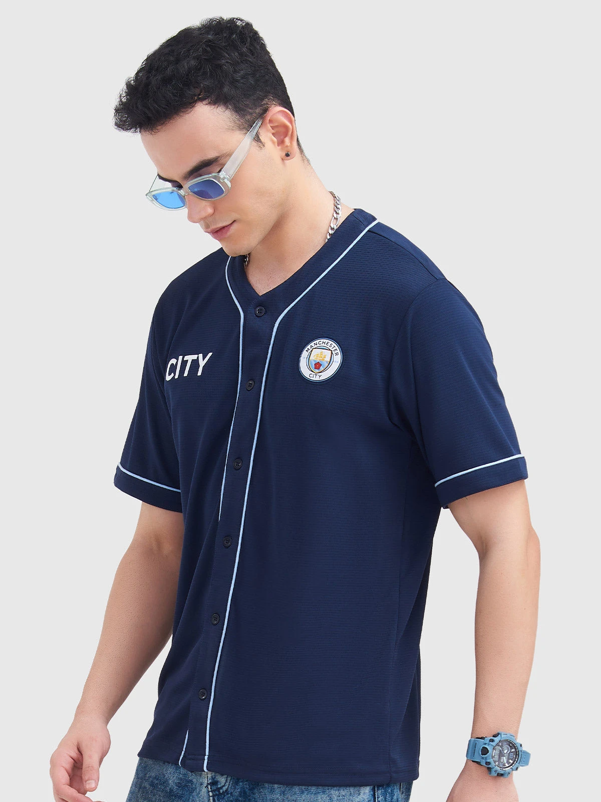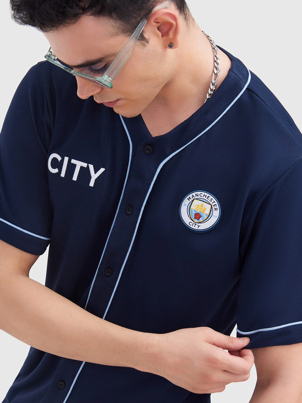 Baseball shirt with Manchester City wordmark on right chest, and logo applique on left chest. Contrast colour piping along sleeve and buttons. Gender: Unisex Fabric: 100% Poly Rice Knit Fit: Regular fit Brand: Manchester City FC