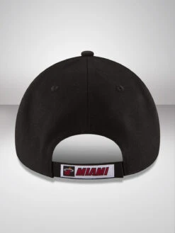 Fully adjustable 9FORTY profile. 6-panel, close fitting contoured crown. Matching curved visor. Miami Heat team emblem embroidered to the front of the crown in raised team colour stitching. Tonal adjustable velcro closure with a woven team label to the rear. Matching black top button and eyelets for breathability. New Era flag embroidered in red stitching to the left hand side.