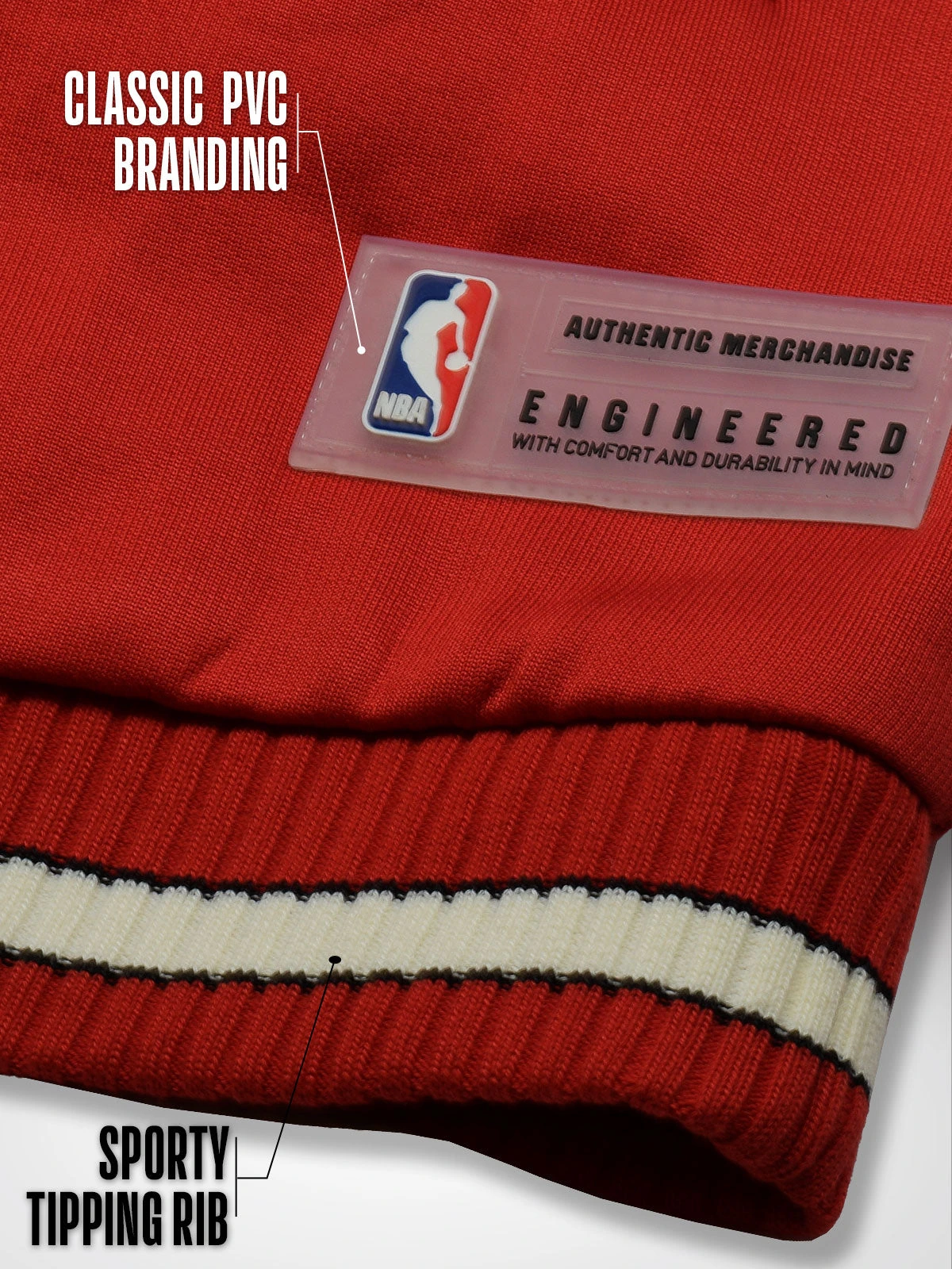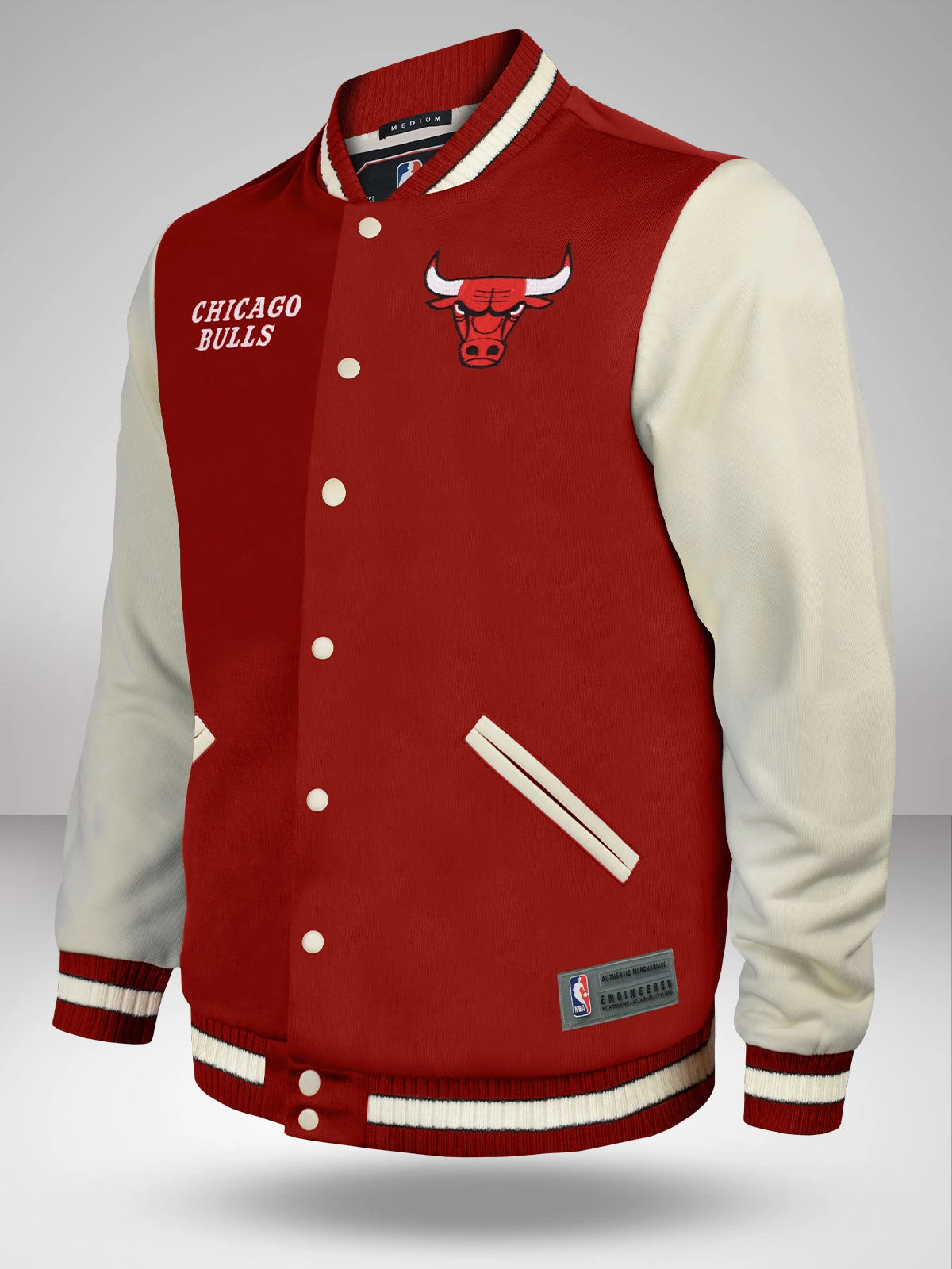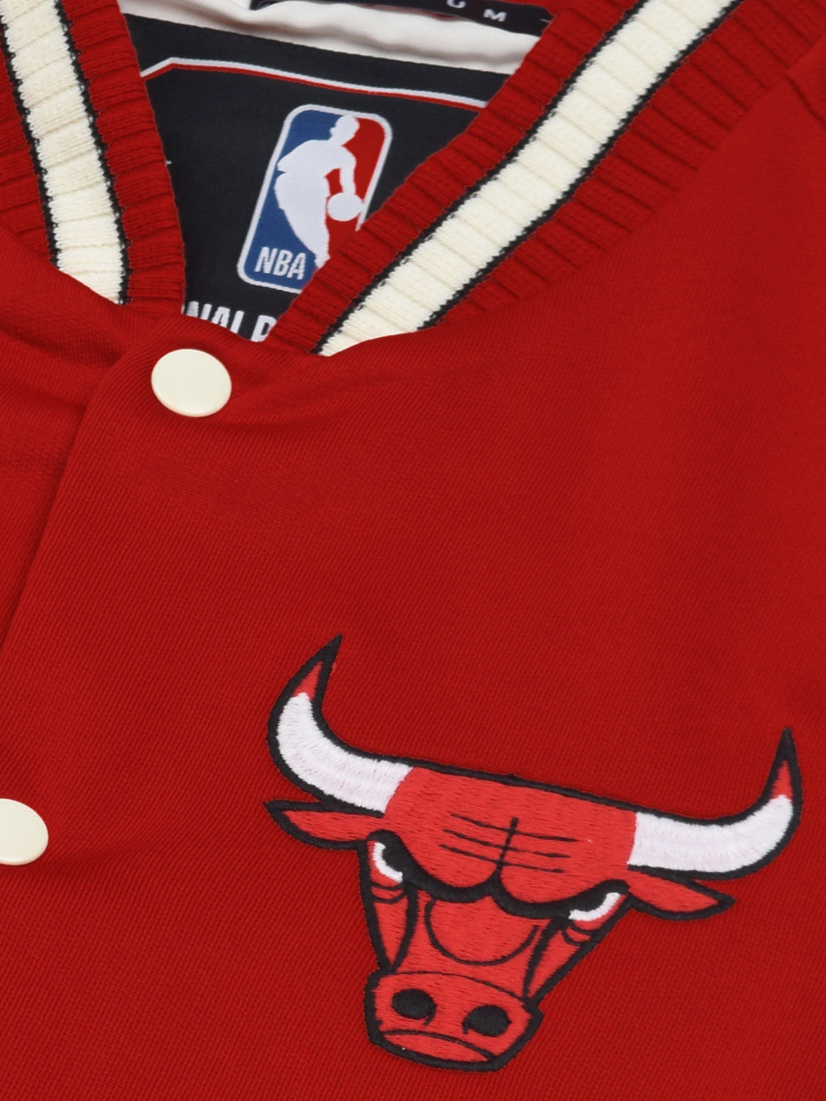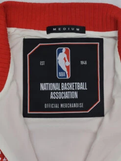 Sporting a rich red body with contrasting cream sleeves, the jacket features the iconic Bulls logo embroidered on the chest, instantly recognizable to any true fan. The timeless design is complemented by the sporty tipping rib on the cuffs and waistband, and classic PVC branding on the hem stands as a testament to its authentic quality.