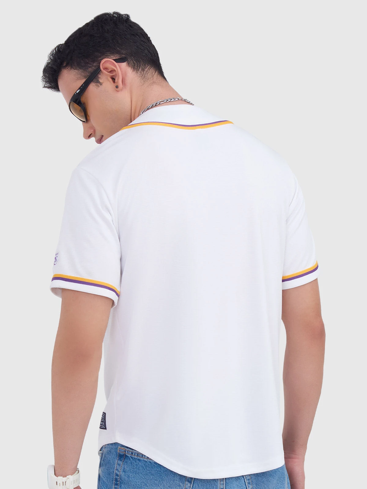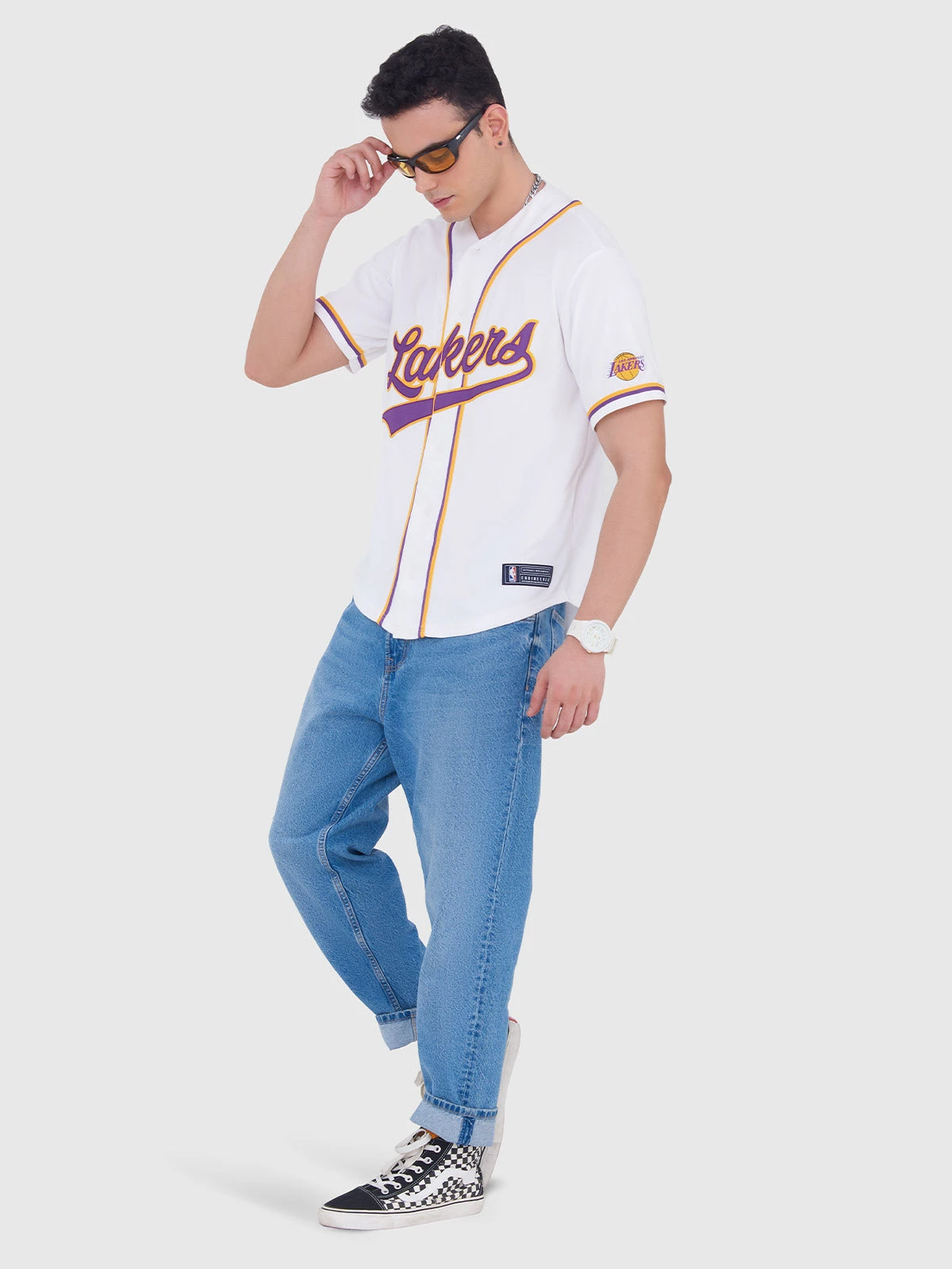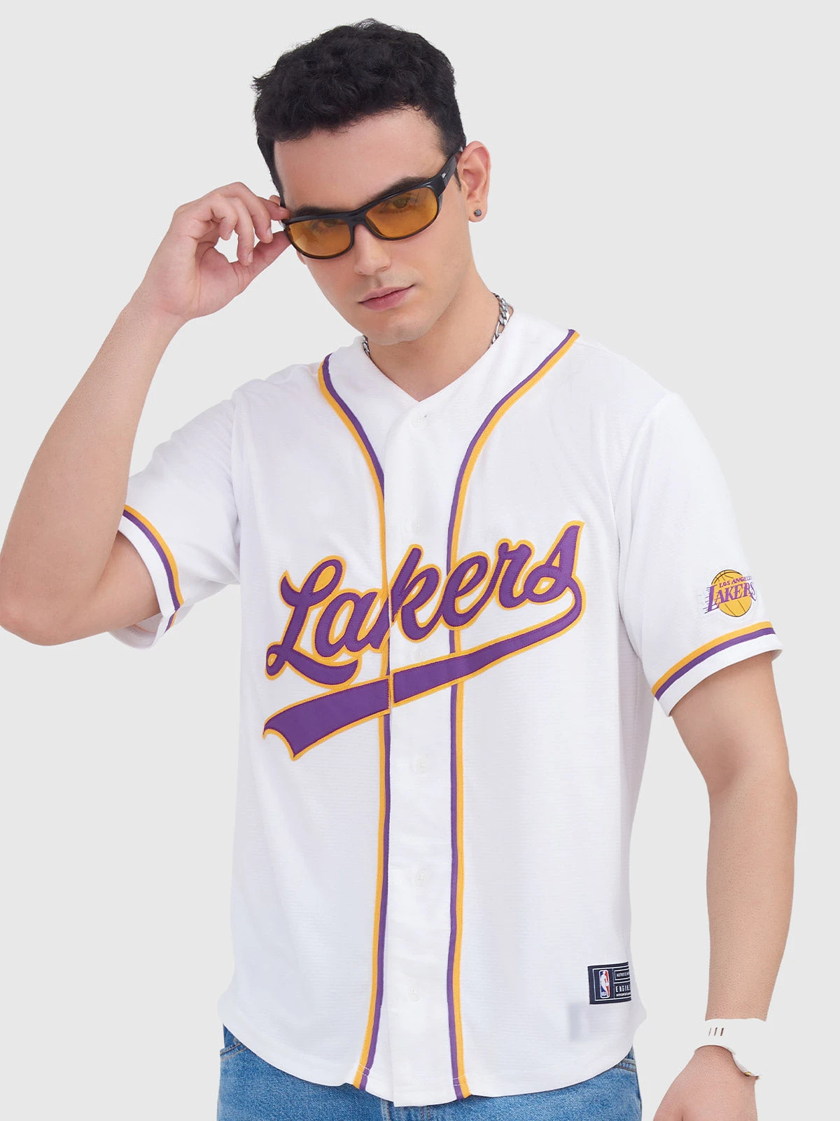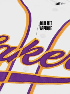 Swing into style with our Los Angeles Lakers Baseball Shirt! This white beauty hits it out of the park with Lakers typography in bold appliqué on the chest and an embroidered Lakers logo on the left sleeve. The playful contrast of mustard and purple tape on the sleeves adds a pop of color, making it a home run choice for fans. Plus, our woven Authentic Merchandise label guarantees you’re getting the real deal. Whether you’re at the game or just hanging out, this shirt brings the Lakers spirit to life.