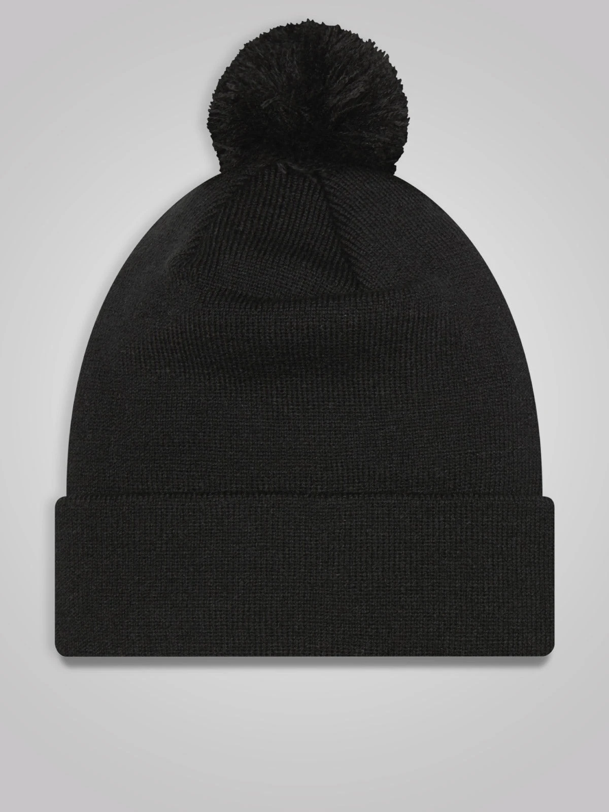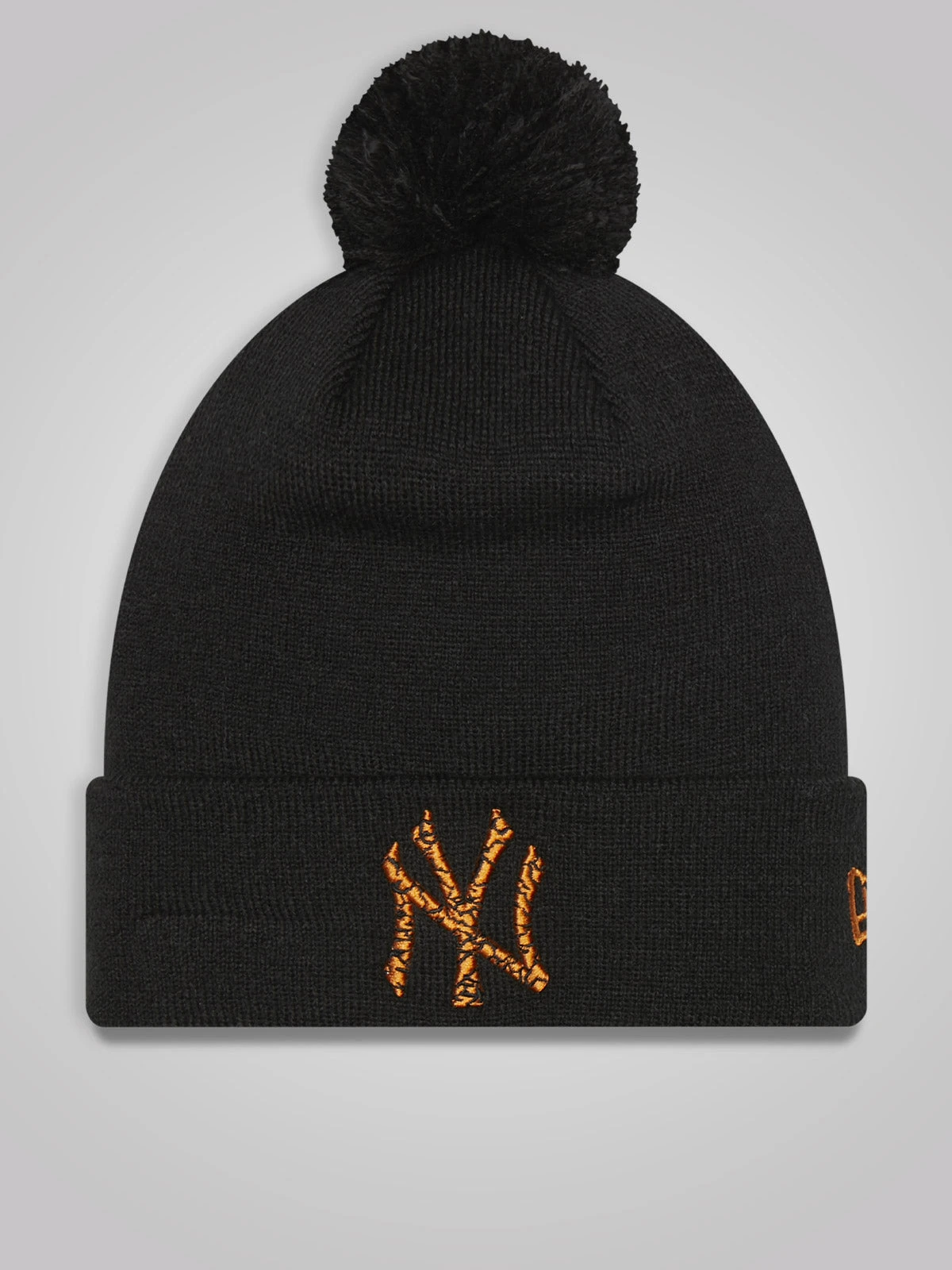Official New Era New York Yankees MLB Infill Black Bobble Beanie Hat. NY logo with infill print on front of cuff. Knitted crown. Upturned cuff. Bobble top. Embroidered New Era flag to the left.