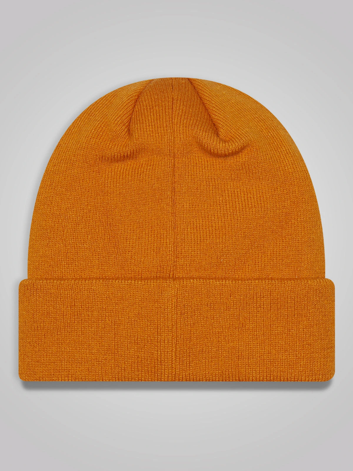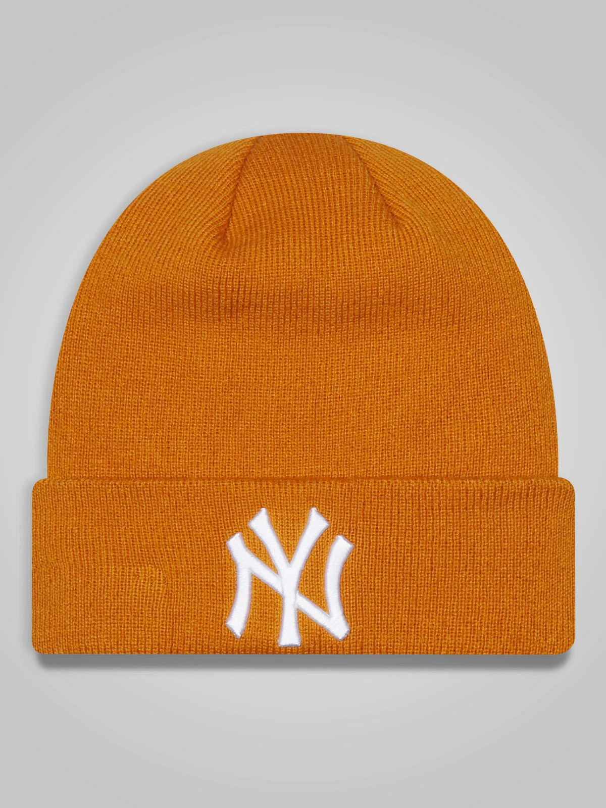 Official New Era New York Yankees MLB League Essential Paprika Cuff Beanie Hat. NY logo on front of cuff. Knitted crown. Upturned cuff. Embroidered New Era flag to the left.