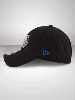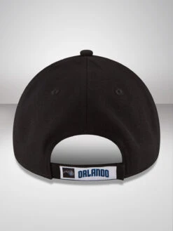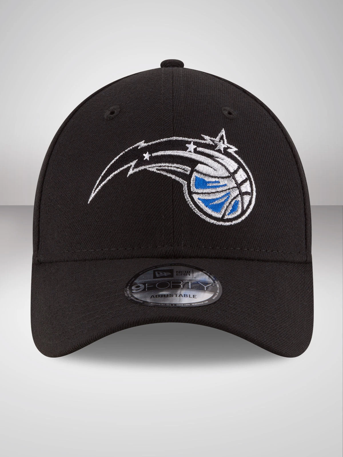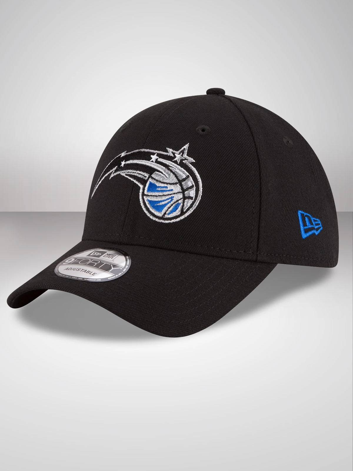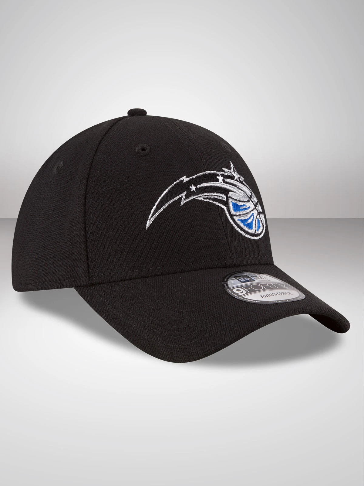 Adjustable 9FORTY fit. Contoured crown with structured panels in all-over black. Matching black curved visor. Orlando Magic’s official team logo embroidered to the front of the cap in team colours. Matching black top button and stitched eyelets. Adjustable Velcro strap with a woven label to the rear. New Era flag embroidered in contrasting blue stitching to the left.