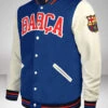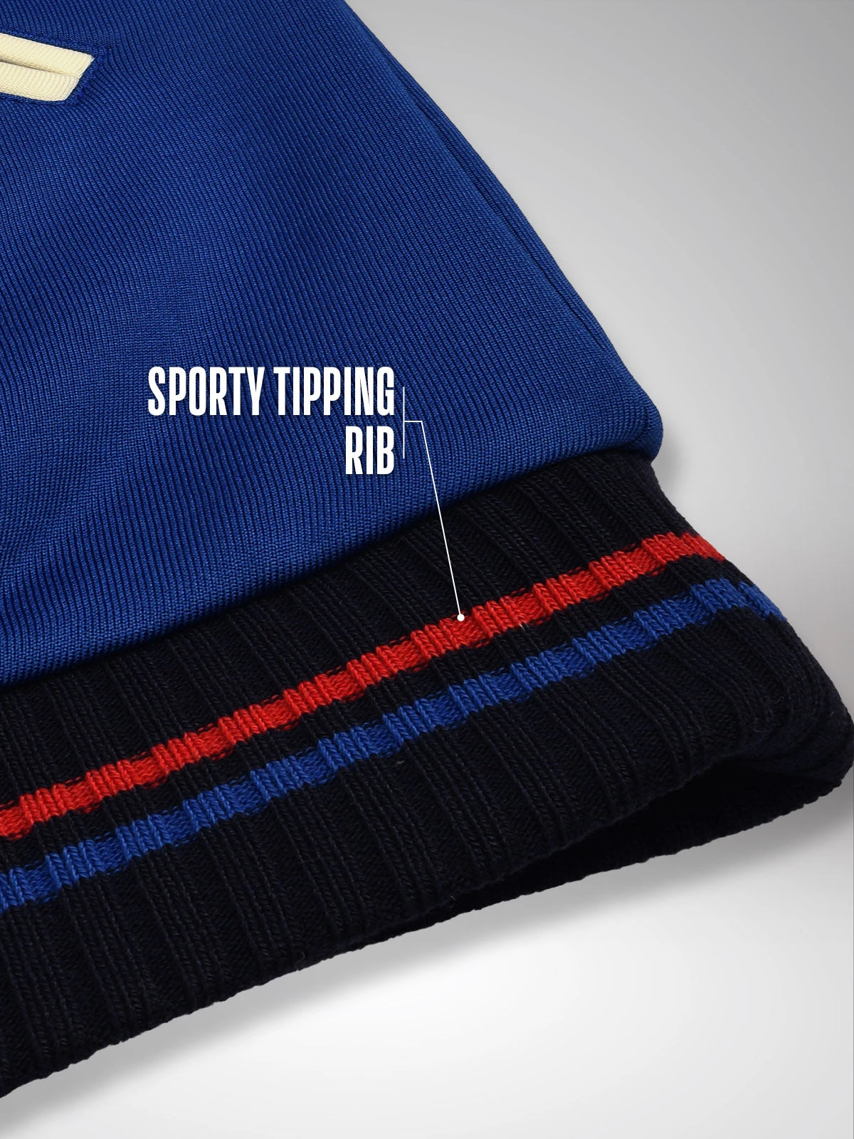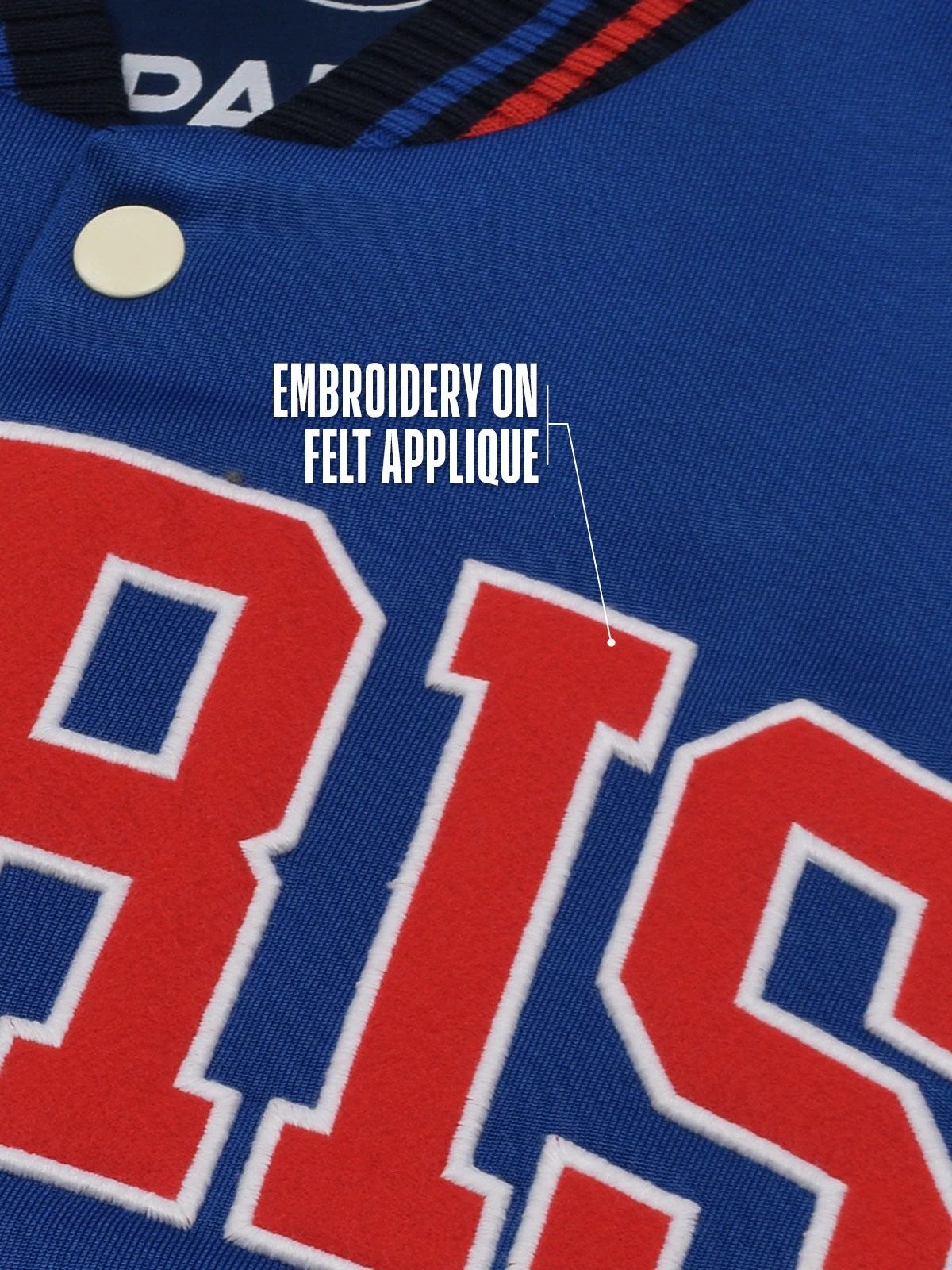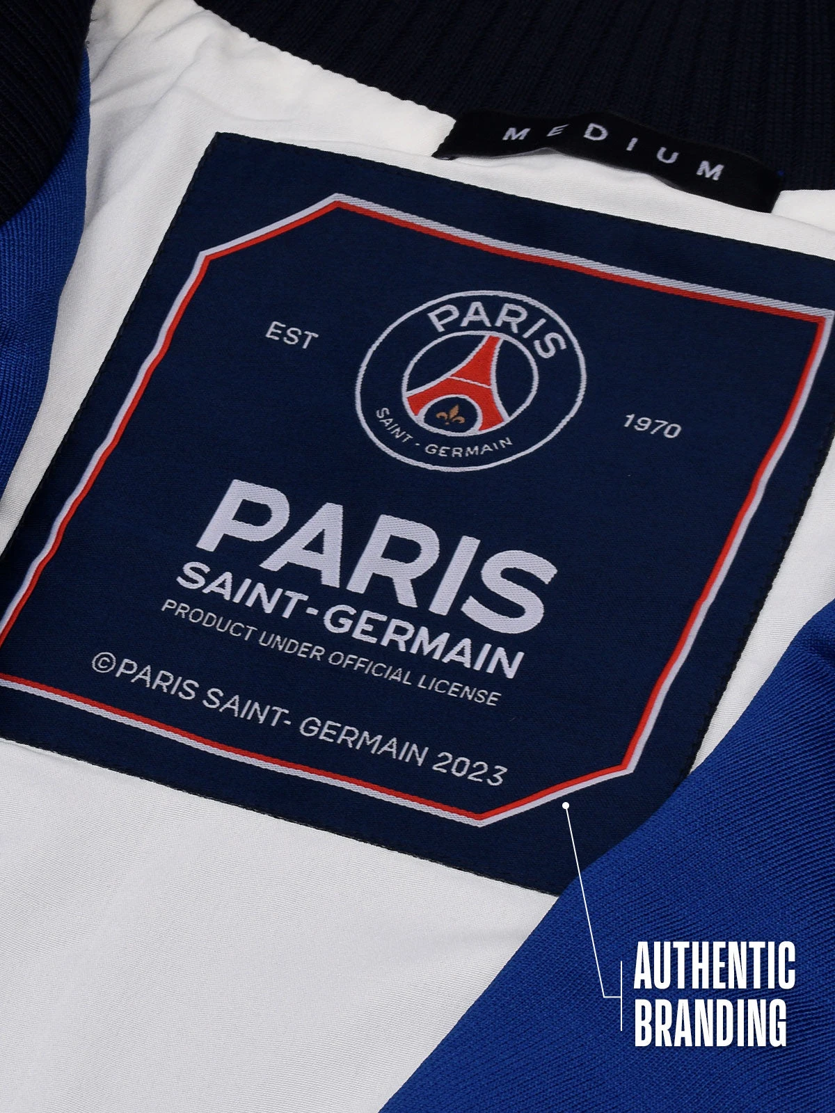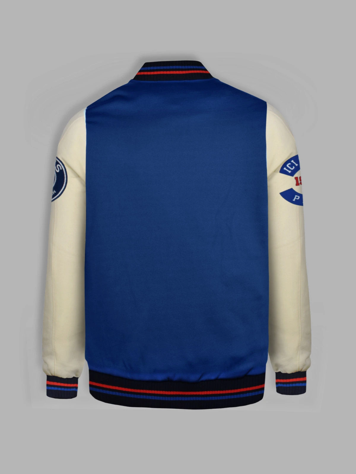 Get your official Paris Saint-Germain F.C. merchandise and sport the colours of one of the most dominant clubs in Europe. Ici C’est Paris! This sporty Letterman Jacket is made with soft fleece and embellished with embroidered logo badges and the PSG branding on the chest. The look is completed with poly fleece sleeves and sports stripped rib at the bottom and sleeves.